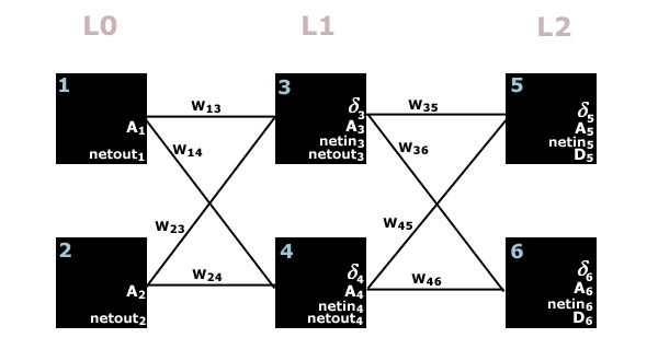 Since we have the error signals Node5.§ and Node6.§ we can use this equation with neurons 3 and 4 in the diagram to update their input weights.
