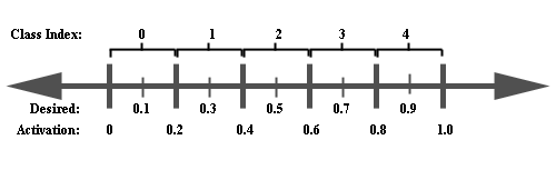 So for example, if the network's output node's activation value A is 0.34, then to find the corresponding index we use (EQU 7):