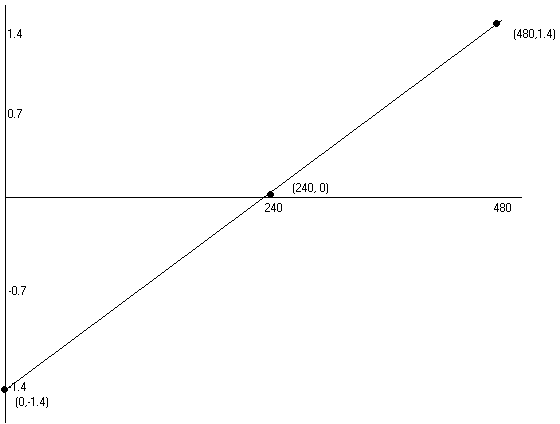 Most likely, the pixel coordinates you will be converting from will start at 0,0 in the top left corner, and go to pictureSize, pictureSize in the bottom right. For this illustration we will use (0 to 480 by 0 to 480). The four variables maxX, maxY, minX, minY are parameters to the Mandelbrot generator and are based on the coordinate system (-1.4 to 1.4 by -1.4i to 1.4i). If one were to map pixels on an X axis with matching argand coordinates on a Y axis, a line like the following would be produced: