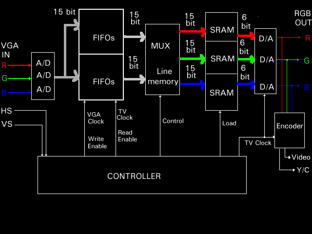 It is not an easy task converting the SVGA, VGA, or XGA signals, used to drive a PC’s monitor to the NTSC or PAL formats that feed a television picture tube. Doing so implies much more than simply connecting a cable from PC to TV. A similar analogy to would be like sliding a Dodge Viper engine under the hood of an old Studabaker. The trick is to downgrade the new technologies’ performance to fit the old, meanwhile keeping the new from blasting the whole effort up in smoke. Fortunately, there are enough brilliant computer engineers in our society to take on the project and present a near perfect jury rigged solution until High Definition Television, (HDTV), can get its foot through the door. Until then, expecting a link from PC to TV to be as crisp as the link from PC to monitor is a false hope. The main tasks that are required to make the VGA converter’s connection possible without excessive compromises are as follows: (1) Match VGA and NTSC horizontal synchronization frequencies. (2) Lower the VGA 75 Hz frame rate to match the NTSC 60 Hz rate. (3) Morph the VGA’s non-interlaced format into an interlaced format. (4) Scale-down the high VGA resolutions to those acceptable by NTSC. (5) Convert VGA picture signals to a specified output format such as s-video or composite.